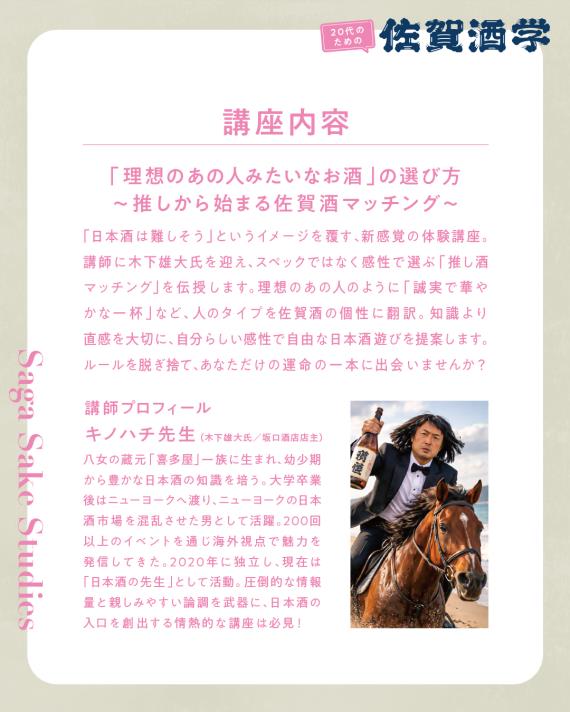これまでの「佐賀酒学」は、飲食店などプロ向けのセミナーとして開催してきましたが、今回は20代をメインターゲットに、佐賀酒の新しい楽しみ方を発見するセミナーとして開催します。